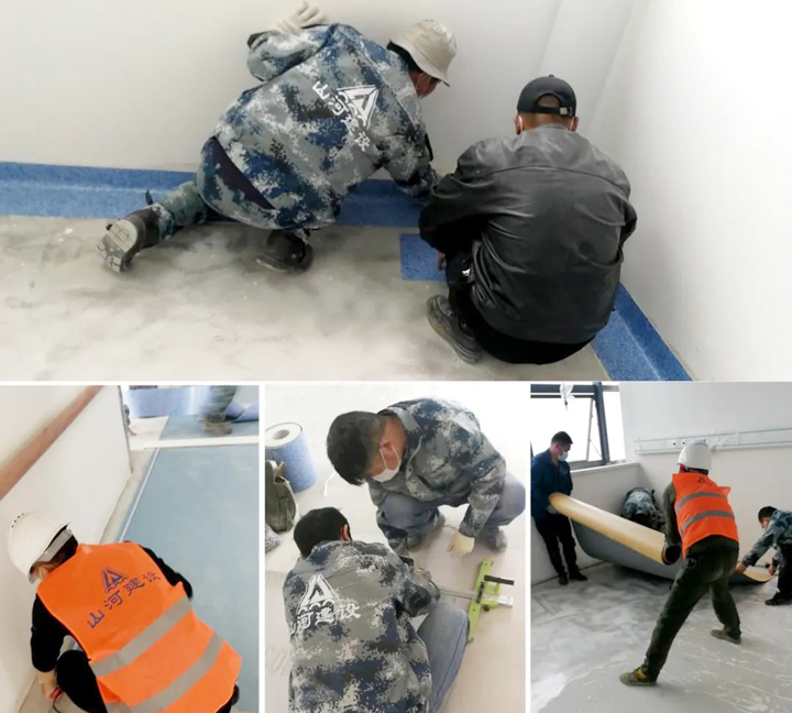 施工現(xiàn)場,多類工種各司其職,搶抓建設(shè)。突擊隊到達(dá)后,承擔(dān)起醫(yī)院住院大樓的部分地面鋪裝任務(wù),需要鋪裝地板膠的面積約3600平方米。分配好工作任務(wù),大家立即投入到緊張的施工中,清潔地面、檢測地坪、預(yù)鋪裁割、上膠、滾壓,每一道工序都一絲不茍。時間緊、任務(wù)重,那就加班加點,即使再苦再累,也要按照時間節(jié)點保質(zhì)保量完成施工目標(biāo),這是山河人一貫的作風(fēng)。