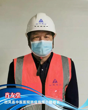 2月26日7時(shí)許,又一所團(tuán)風(fēng)版“小湯山”——即將竣工的縣中醫(yī)醫(yī)院新院區(qū)應(yīng)急改造工程正在加緊施工,肖友堂被任命為項(xiàng)目防疫指揮小組組長(zhǎng),帶領(lǐng)一支近40人的突擊隊(duì)趕到現(xiàn)場(chǎng)增援。
