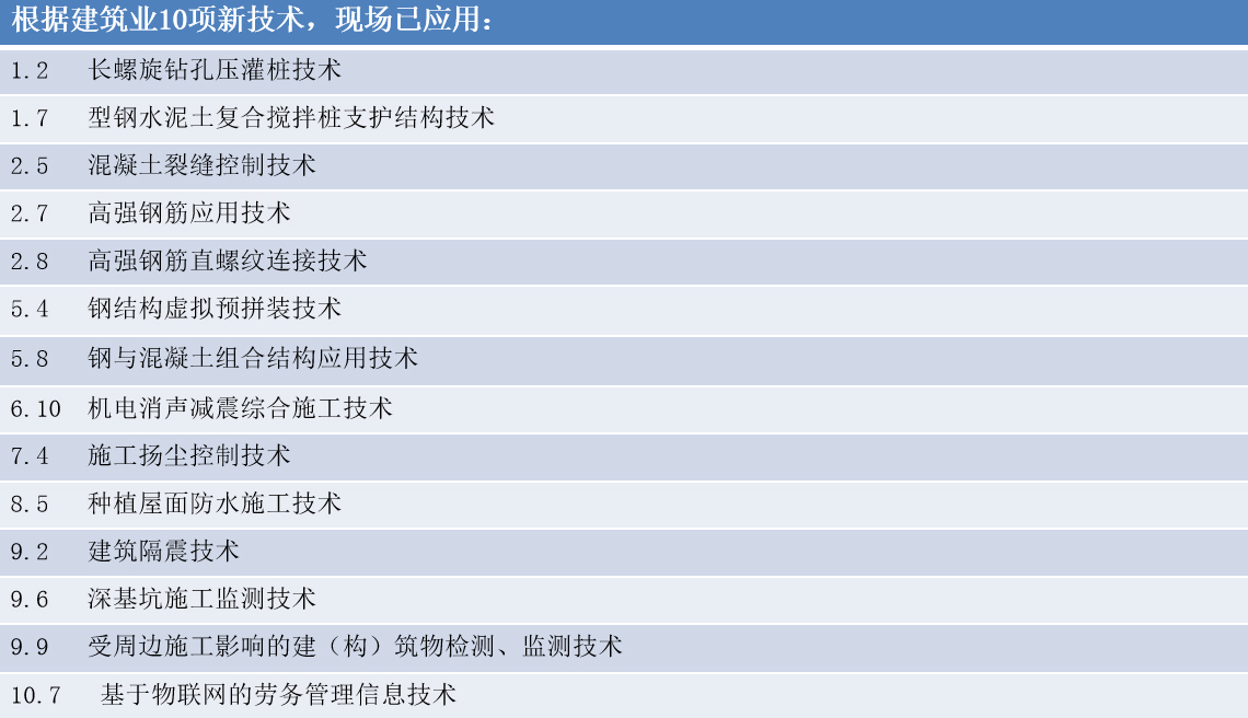 開(kāi)工伊始,項(xiàng)目部建立了新技術(shù)應(yīng)用管理體系,從組織上保證新技術(shù)推廣應(yīng)用順利實(shí)施,同時(shí)根據(jù)現(xiàn)場(chǎng)實(shí)際情況把新技術(shù)應(yīng)用項(xiàng)目進(jìn)行分解,落實(shí)至班組,責(zé)任到人。施工過(guò)程中,該項(xiàng)目先后應(yīng)用了長(zhǎng)螺旋鉆孔壓灌樁技術(shù)、型鋼水泥土復(fù)合攪拌樁支護(hù)結(jié)構(gòu)技術(shù)、混凝土裂縫控制技術(shù)、高強(qiáng)鋼筋應(yīng)用技術(shù)等十余項(xiàng)建筑業(yè)新技術(shù)。海南公司工程部定期到現(xiàn)場(chǎng)進(jìn)行檢查、驗(yàn)收和指導(dǎo),確保新技術(shù)應(yīng)用落到實(shí)處,見(jiàn)到實(shí)效。
