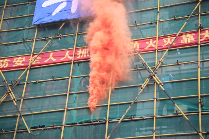 “失火了!”一陣急促的喊聲打破了施工現(xiàn)場的平靜,一股“濃煙”從正在建設(shè)的樓棟里冒出,形勢緊急。“立即啟動應(yīng)急救援預(yù)案!應(yīng)急小組各就各位!”隨著項(xiàng)目經(jīng)理一聲令下,“事故現(xiàn)場”迅速展開救援……
