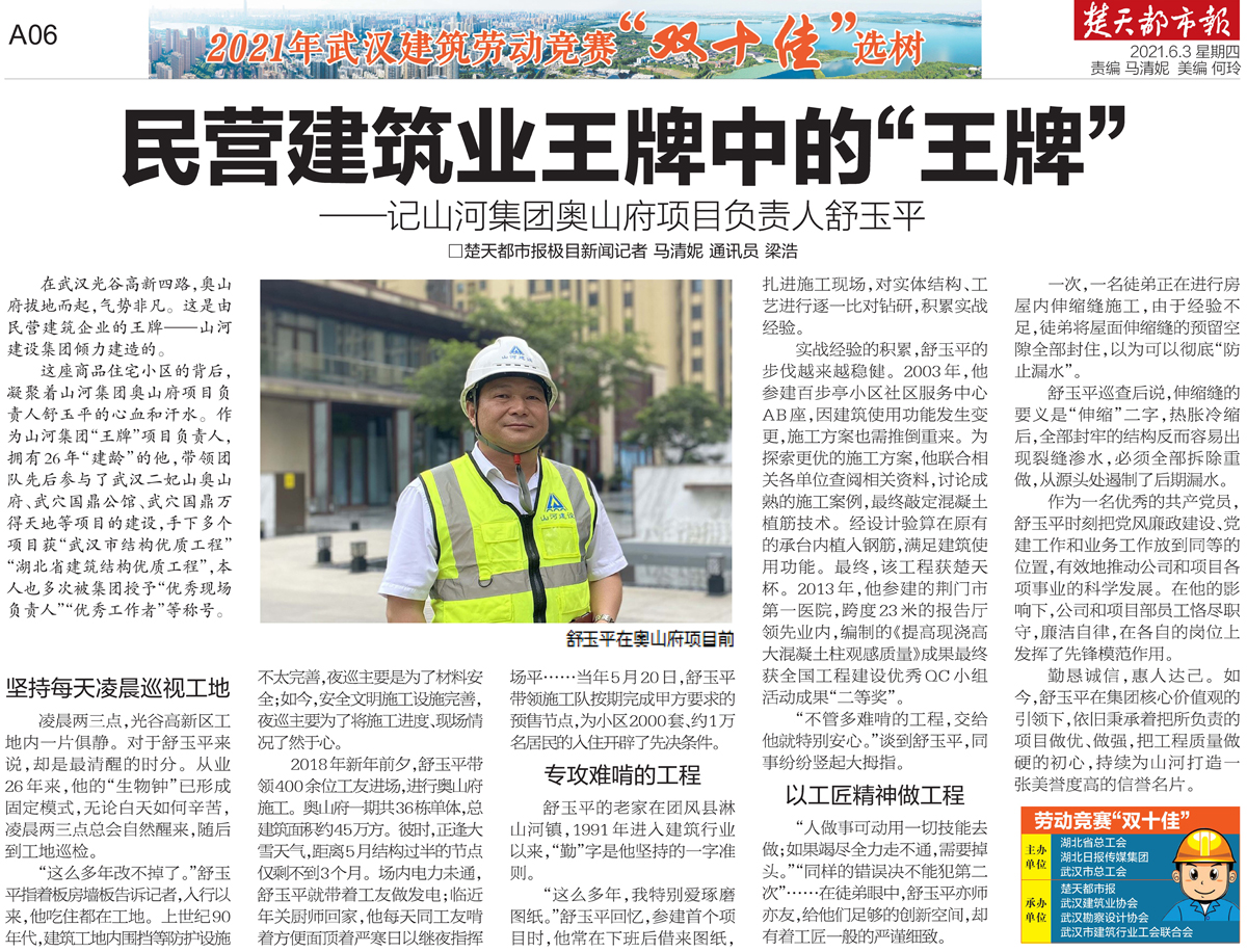 這座商品住宅小區(qū)的背后,凝聚著山河集團(tuán)奧山府項(xiàng)目負(fù)責(zé)人舒玉平的心血和汗水。作為山河集團(tuán)“王牌”項(xiàng)目負(fù)責(zé)人,擁有26年“建齡”的他,帶領(lǐng)團(tuán)隊(duì)先后參與了武漢二妃山奧山府、武穴國鼎公館、武穴國鼎萬得天地等項(xiàng)目的建設(shè),手下多個項(xiàng)目獲“武漢市結(jié)構(gòu)優(yōu)質(zhì)工程”“湖北省建筑結(jié)構(gòu)優(yōu)質(zhì)工程”,本人也多次被集團(tuán)授予“優(yōu)秀現(xiàn)場負(fù)責(zé)人”“優(yōu)秀工作者”等稱號。