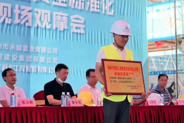 新余市質(zhì)監(jiān)站站長龔宇新宣讀了《2021年新余市建設(shè)工程質(zhì)量安全標(biāo)準(zhǔn)化暨揚(yáng)塵治理示范工地表彰決定》,聯(lián)發(fā)永康狀元府項(xiàng)目成為本次全市唯一一個示范工地,項(xiàng)目經(jīng)理袁傳根作為代表上臺領(lǐng)獎。