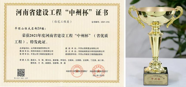 近日,河南省人力資源和社會(huì)保障廳、河南省住房和城鄉(xiāng)建設(shè)廳共同頒發(fā)“2021年度河南省建設(shè)工程中州杯(省優(yōu)質(zhì)工程)獎(jiǎng)”,山河建設(shè)集團(tuán)河南公司承建的平頂山恒大名都2#樓喜獲“中州杯”榮譽(yù)。這是河南省建設(shè)工程質(zhì)量最高獎(jiǎng),代表著全省工程建設(shè)質(zhì)量的最高水平。