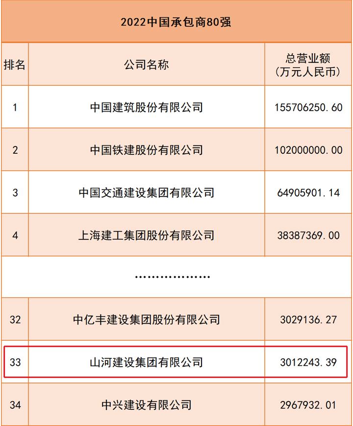 會上公布的“中國承包商80強(qiáng)”榜單上,山河建設(shè)集團(tuán)名列第33位。2022年度“中國承包商80強(qiáng)”以2021年度企業(yè)工程承包營業(yè)收入作為主要排名依據(jù),展示了新一屆中國建筑業(yè)行業(yè)領(lǐng)軍者的風(fēng)采。